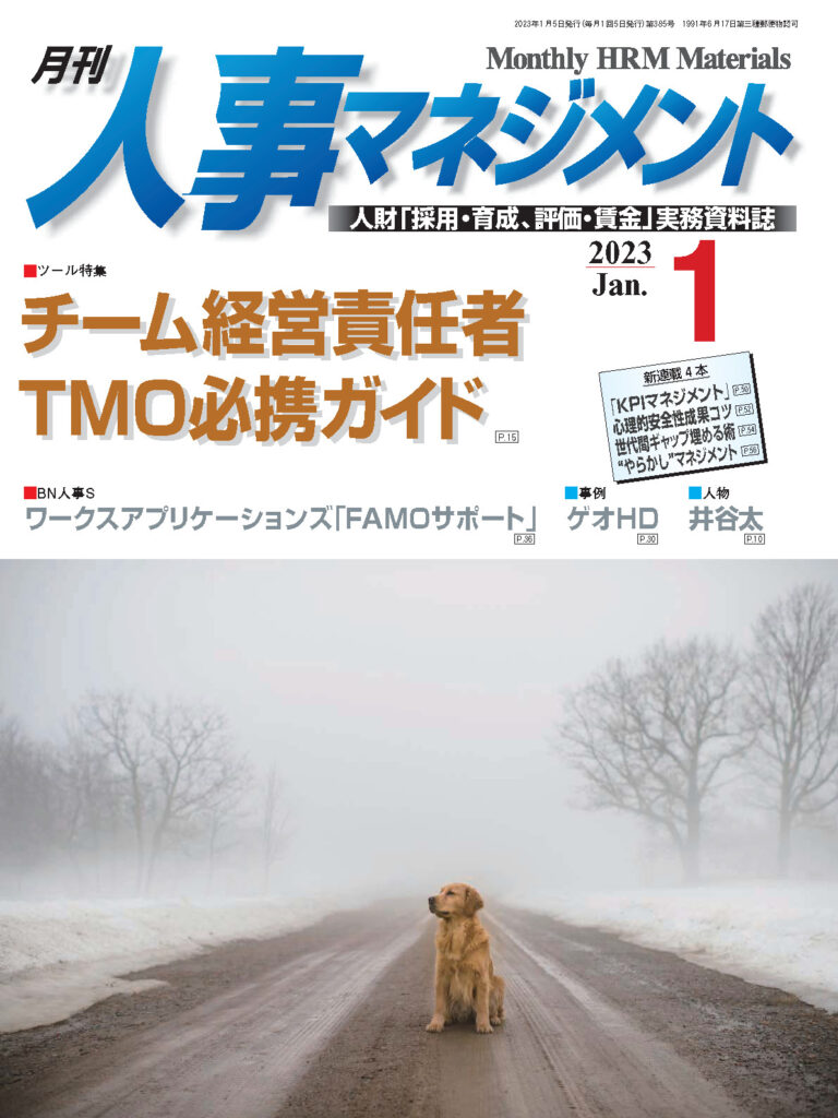 2023.02.16 「月刊人事マネジメント」1月号に掲載されました。 「月刊人事マネジメント」1月号に「リーダー自身が変わる勇気を持つ」というテーマで弊社代表取締役の記事が掲載されました。 <<前のページ 次のページ>> 戻る